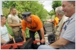 Nachdem die Waldarbeiter Feierabend gemacht hatten(schnarch, schnarch) hätte man ja schlafen können, doch da nahte schon das Frühstück, was uns vom Gastgeber serviert wurde. Reichlich gesättigt ging es an die Begutachtung der Draisine 670 Kg, hätten wir dabei mal besser aufgepasst. Nachdem verladen der Getränke ging es also los.